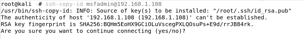 We now need to copy the public key to the server (Metasploitable2). We can do this by using the ssh-copy-id command.