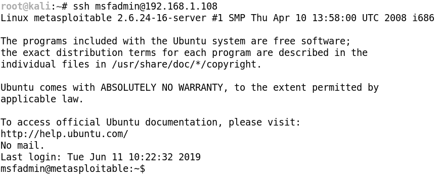 We are able to get the SSH password for the user msfadmin very easily, this shows you the importance of securing SSH correctly and using SSH keys rather than passwords.