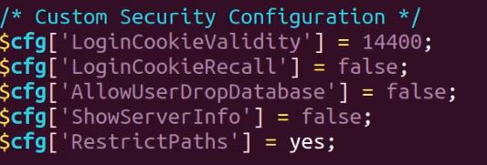 We can also add specific PHP configurations to make phpMyAdmin much more secure by stripping all server or system information and by modifying the cookie authentication parameters.