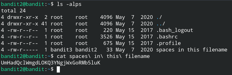 The password for the next level is stored in a file called spaces in this filename located in the home directory